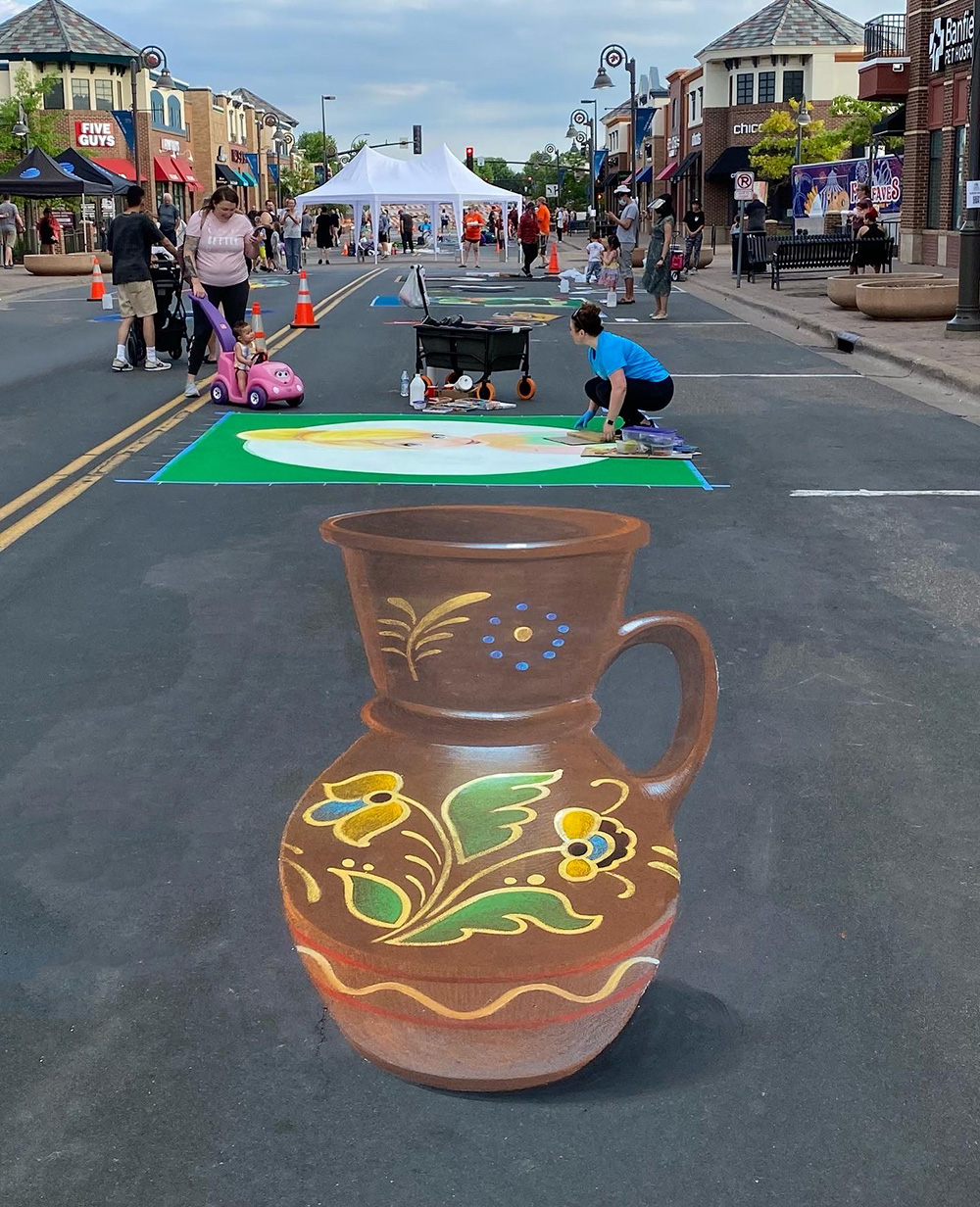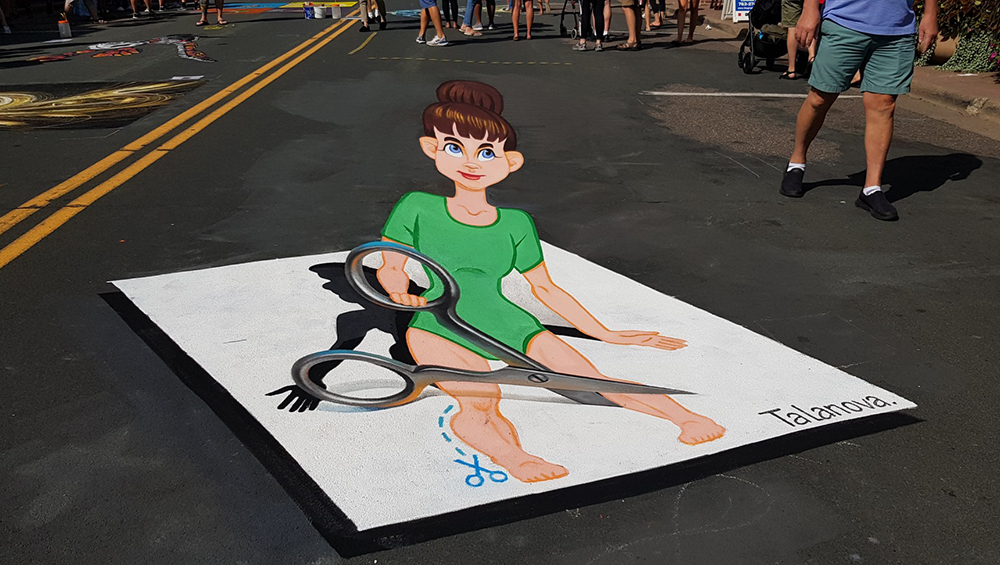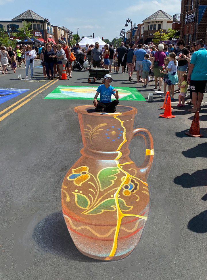 I create anamorphic drawings on asphalt that transform flat surfaces into captivating three-dimensional illusions, capturing the imagination of viewers.
